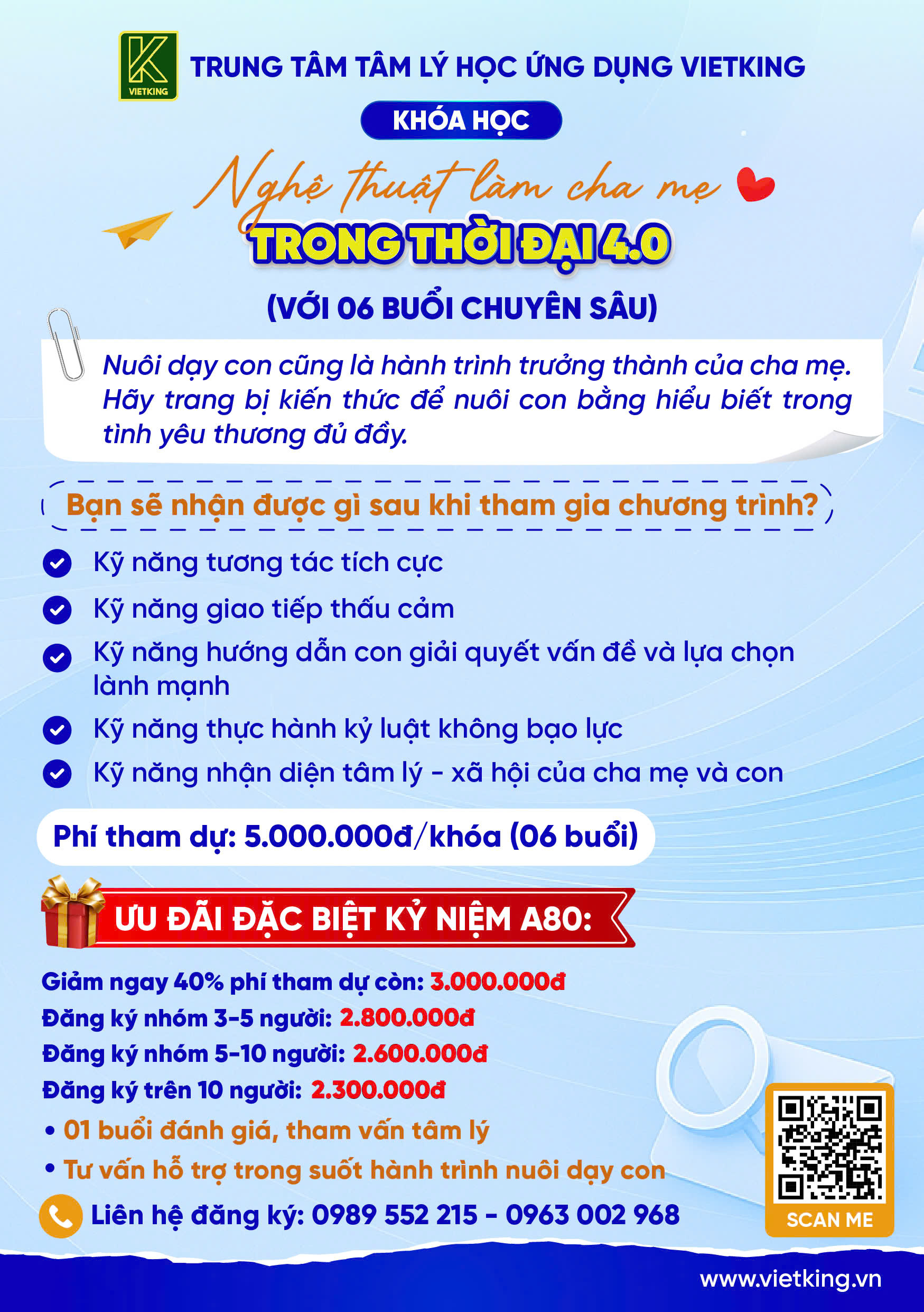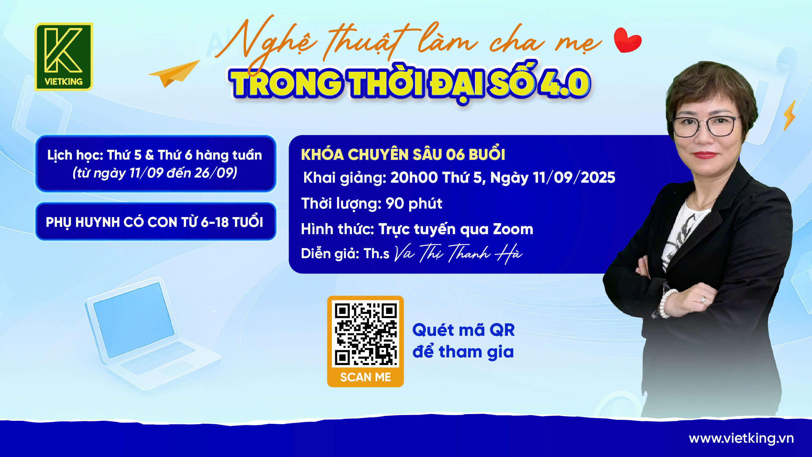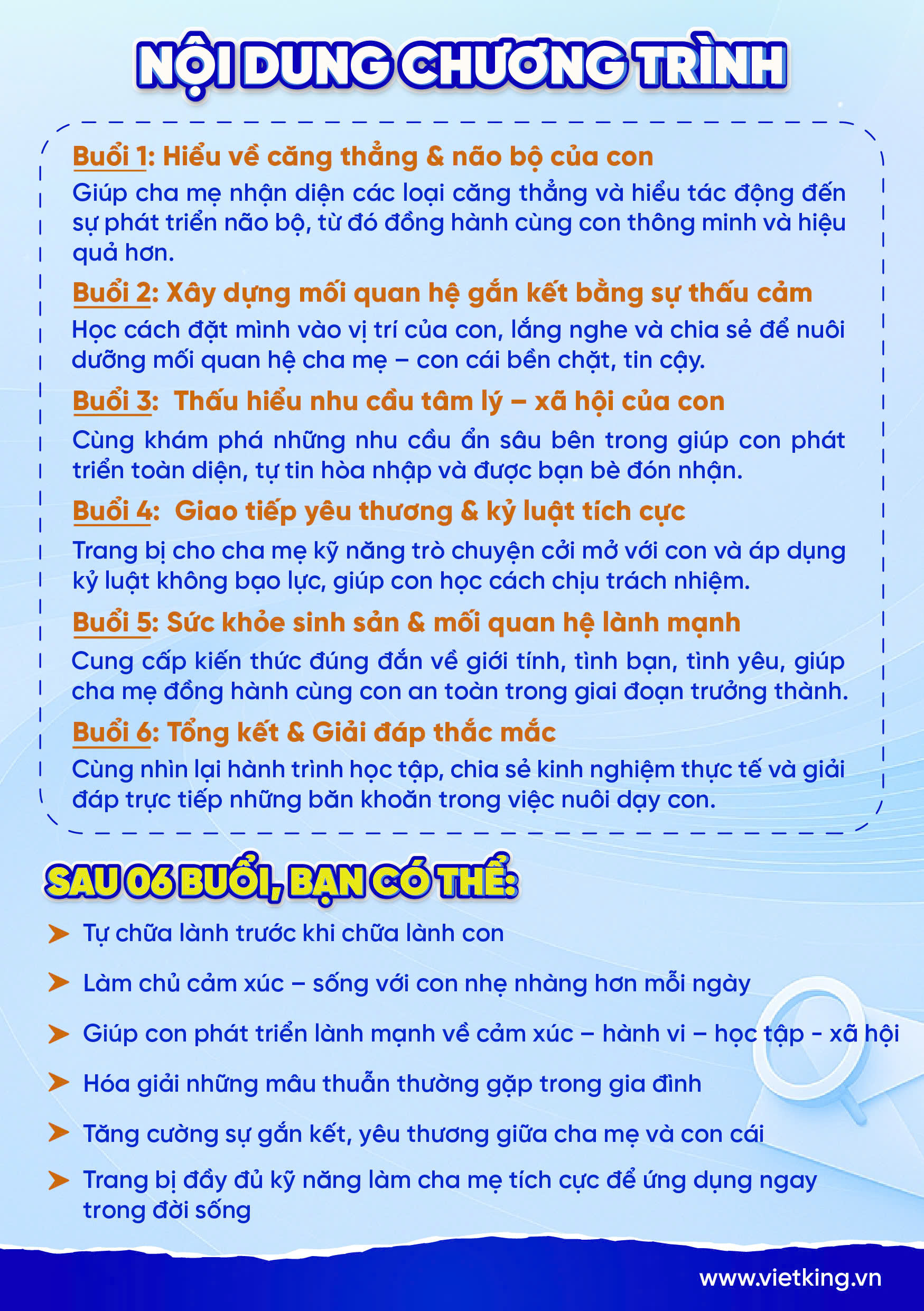 Với mong muốn trang bị cho phụ huynh hành trang vững vàng, VietKing xây dựng khóa học chuyên sâu “Nghệ thuật làm cha mẹ thời đại 4.0” – một chương trình 6 buổi học bài bản, hệ thống và thực tế.